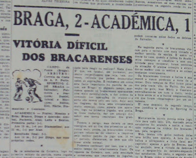 E esta eu não vi nem li descrito em lado nenhum, mas aposto que, como com bracarense que é, o Bino também deu uns casquetes na confusão que se gerou na vinda dos gregos a Braga. Depois de sofrer uma entrada de Perrichon, Vassilion pontapeou Luciano no baixo ventre e, ainda segundo a Bola, “houve três minutos de porrada, empurrões e sopapos, ameaças e piropos” que só a intervenção da polícia conseguiu serenar. Hoje sei que o sr. Albino Sousa nem é homem de se meter em confusões, mas também não duvido que lhe deve ter sabido bem molhar a sopa no mau perder dos gregos. Desta vez houve dois arraiais: um de bola e outro de porrada, porque os limites da hospitalidade, para um homem minhoto de gema, acabam no baixo ventre.